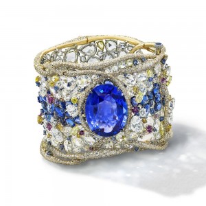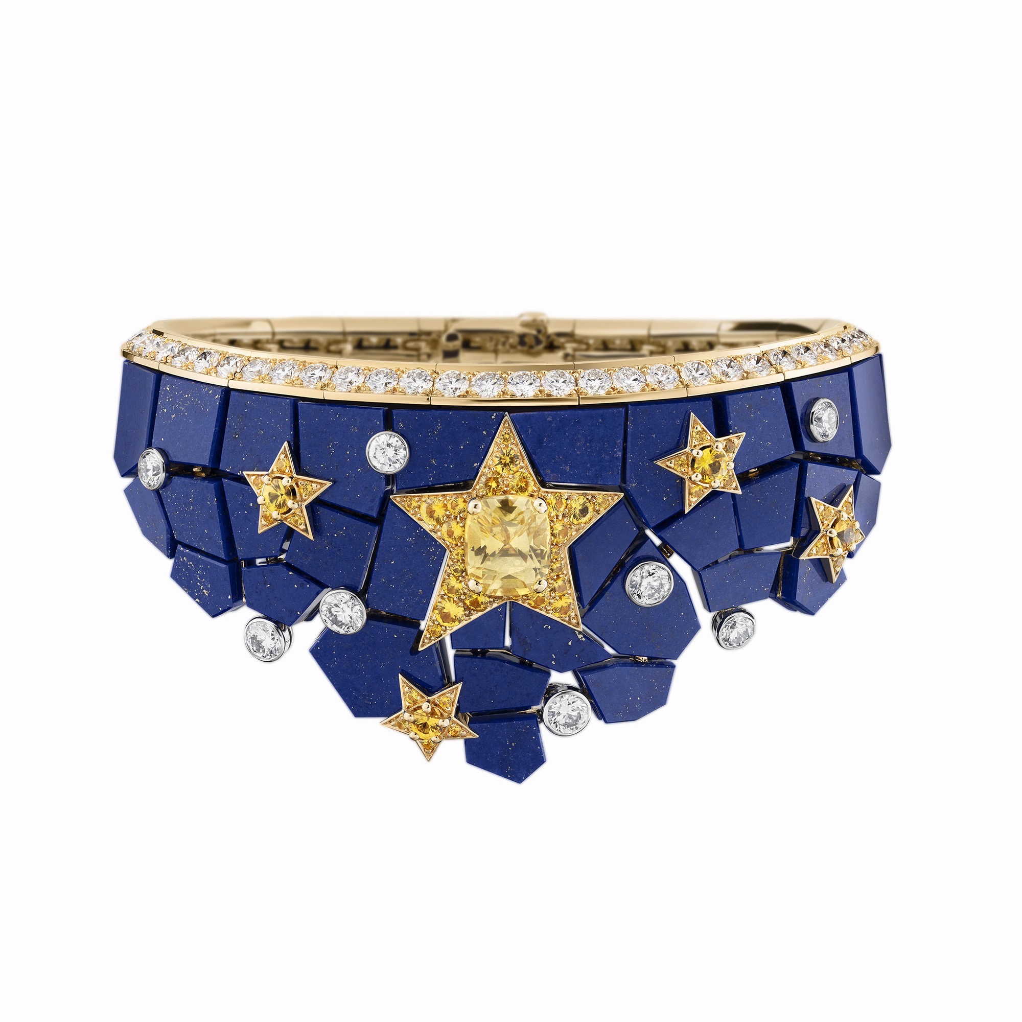 Sentier d’Etoiles bracelet is inspired by NGC 7098 — the main stone is a curved sapphire that weighs 69.23ct and represents the galaxy’s bright central core of stars. The inner layer is inlaid with sapphires and saffron stones, representing the stars; the middle is inlaid with a long stepped diamond and a shining star made of gold; the outermost glaring yellow diamond represents a bright new star in the making.