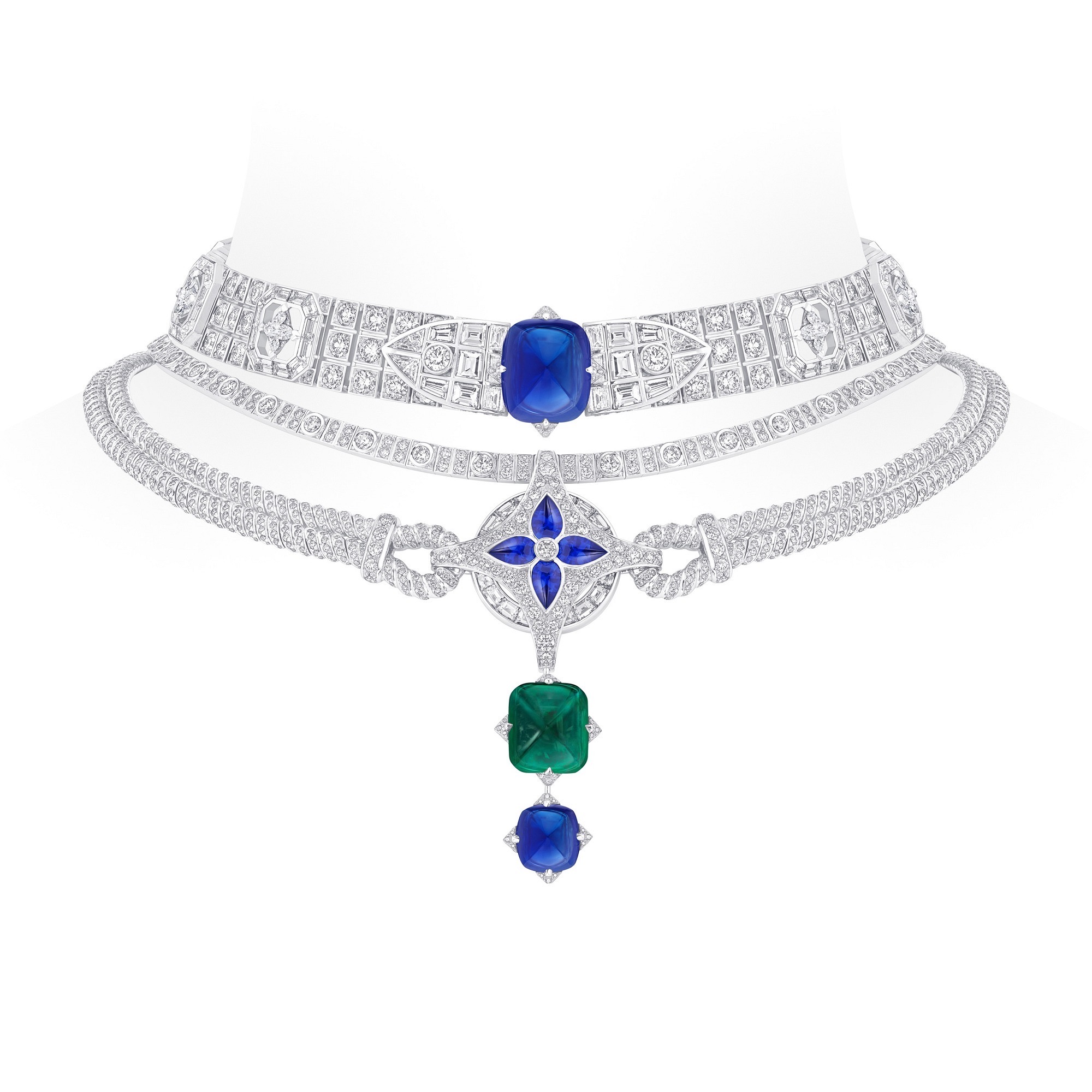 In tribute to the pioneering spirit of Louis Vuitton, the brand founder, Le Mythe necklace cleverly integrates Monogram pattern, Damier checkerboard pattern, luggage rivets and other classic elements into the three-layer structure. The gemstones are beautifully matched — you can see Sri Lankan sapphires weighing 19.70ct, Colombian emeralds weighing 8.64ct and Madagascar sapphires weighing 7.11ct, all cut with sugar loaf mountain to highlight the rich and intense color of the gemstone. Also notable are the six star-cut diamonds, designed independently by Louis Vuitton, which naturally echoes the Monogram pattern.